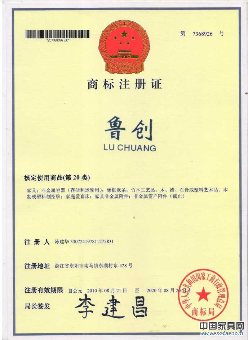 “魯創”紅木家具注冊商標——東陽市大聯魯創家具廠