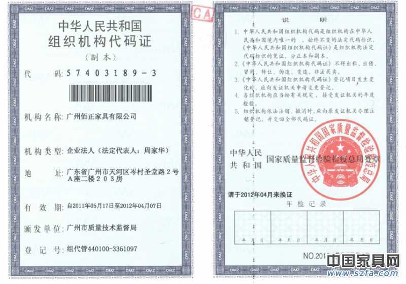 證書介紹 廣州佰正家具有限公司組織機(jī)構(gòu)代碼證副本 企業(yè)網(wǎng)站:www.gzberthy.com 證書圖片 |