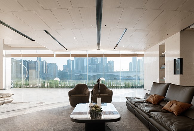 一層以接待前廳和模型展示區兩個空間為主,視覺上的多維立體感,豐富著空間的表達,各個區域之間的轉換自然而流暢,整體空間呈現出簡約寧靜而不失溫馨的當代氣息。切割感的線條,形成了空間塊面自然折疊的效果,消解了堅實和輕盈之間的二元概念。天花的體塊呈階梯式向兩側隱退之狀,呼應著山城重慶的地形地貌。
