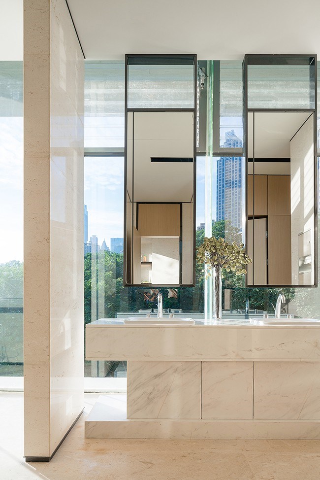 細膩的米色大理石結構空間,相近的木色與之互相映襯,保證了整體色彩的統一性,協調建筑體塊塑造的莊嚴肅穆感。挑高的空間架構中,通過天花與墻面連續一體的設計,塑造出空間整體的延伸性,而墻體前后塊面的錯落,塑造出了空間的多維層次感。空間開闊大氣而又不至于一覽無余,簡單中的微妙轉折,更新著人們的視覺感受。