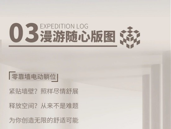 核心提示:零靠墻電動躺位,緊貼墻壁照樣盡情舒展,釋放空間從來不是難題,為你創造無限的舒適可能。