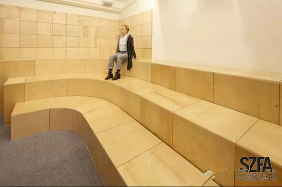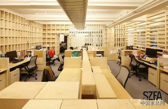 Taylor and Miller為他們開發了辦公室隔墻和家具系統,都是由不同尺寸和直線形狀的基本膠合板箱做成的。由多個隨機的方式安排的盒子組成了隔墻,這樣就允許了空間中的視覺連通性,當移動到新的空間后,原來的盒子被重新組織,用了單一的盒子形狀來搭建整面隔墻。對于設計師來說,這個想法是:隨著辦公室的擴展,在新的空間里增加了更多的勞動力,在人口密度增加和任務有重疊的情況下,辦公有一定程度的紊亂,該建筑體系的設計,將抵消這一混亂走向;盒子的重復性和紋理將這個工作間與下一個工作間分開,給員工提供了一個安靜的空間和隱私分層。
