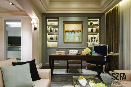 在整個公共區域上使用開放無隔間的方式來表現出書房及客廳,整體更能帶出空間的奢華與寬敞感,視覺效果也得到增強。