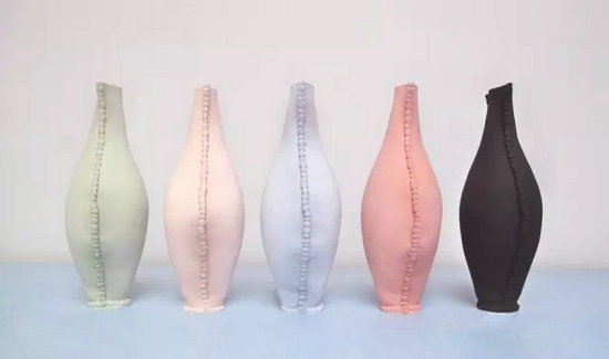 Charlotte對布藝情有獨(dú)鐘,即便是常規(guī)思維中不能以布料為材質(zhì)的物品,她仍會發(fā)揮想像,進(jìn)行極具視覺張力的布藝應(yīng)用嘗試。Stiched urn系列的縫紉花瓶便是一次視覺與觸覺的顛覆性探索。這個(gè)系列以注漿成型法鑄造瓶子的形狀,刻意的縫邊設(shè)計(jì)帶來手工制作的錯(cuò)覺,多彩的釉下彩表面形成天鵝絨般的質(zhì)感,以假亂真的布藝花瓶平衡了柔和與堅(jiān)硬的矛盾屬性。